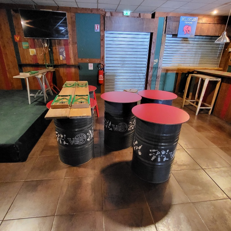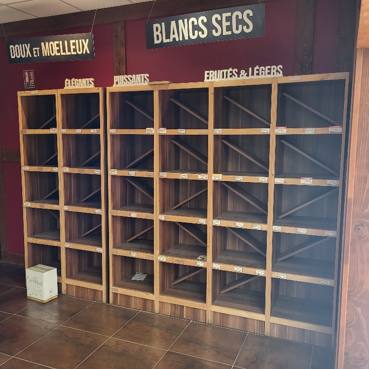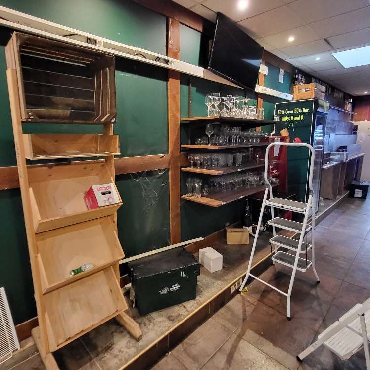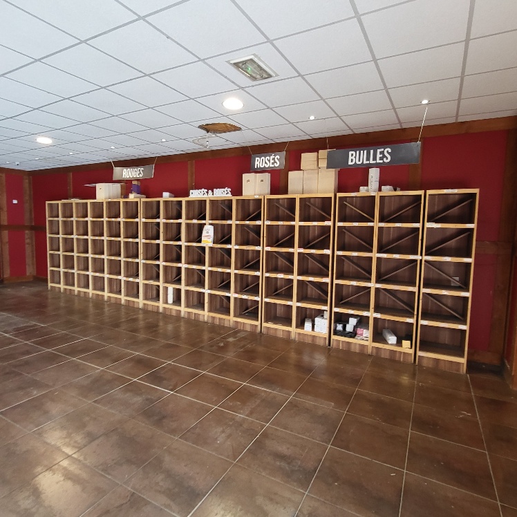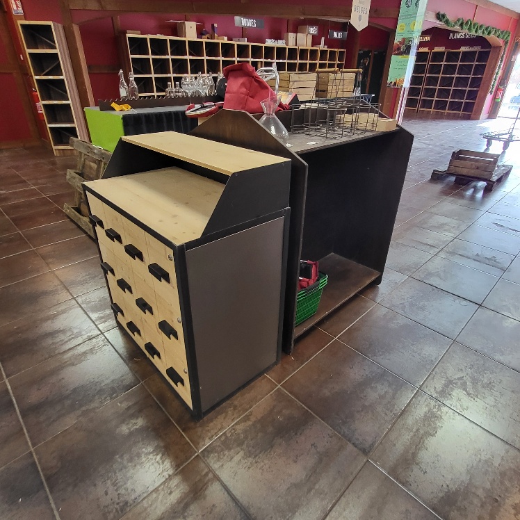 –25 étagères verticales de présentation en bois et stratifié faux bois présentant 5 niches – larg. 0.50m, 5 étagères de présentation en bois foncé à 2, 3 ou 4 niveaux – larg. 6m (1), 4m (1) et 2m (3), 6 porte-affiches métalliques laqués noir sur socle, demi-tonneau de présentation en bois sur socle, chariot métallique laqué gris à 2 niveaux, marchepieds pliant métallique laqué blanc à 3 marches, 3 vitrines de présentation en bois ouvrant à 2 portes vitrées et 2 tiroirs, présentoir central double faces en bois foncé – larg. 1.20m, pupitre en bois et acier ouvrant à 12 tiroirs, présentoir central en stratifié vert dessus stratifié gris – larg. 4m, 5 tonneaux en bois formant tables hautes, 13 tabourets de bar divers en bois et acier, 2 tables rectangulaires 6 places dessus en bois à piètement pliant métallique laqué vert, 6 bancs 3 places en bois à piètement pliant métallique laqué vert, téléviseur à écran plat LG 150 cm, table haute ronde dessus stratifié blanc à piètement pliant en acier, table haute ronde dessus en bois logoté « V&B » à piètement métallique laqué noir, table rectangulaire dessus gris à piètement en bois, présentoir vertical de bouteilles en bois à 5 niveaux dont 3 inclinés, 2 marchepieds pliants métalliques laqués blanc à 2 ou 4 marches, 2 systèmes de tirage réfrigérés de style industriel à 4 pompes avec groupe de froid et vannes, tiroir-caisse, lave-verres FRIONOR en inox, lot de verrerie diverse, réfrigérateur combiné DAEWOO, réfrigérateur BEKO – mauvais état général, 8 planches à découper en bois, 3 étagères en acier laqué gris diverses à 3, 4 ou 4 niveaux – larg. 0.80m (2) ou 1m (1),
