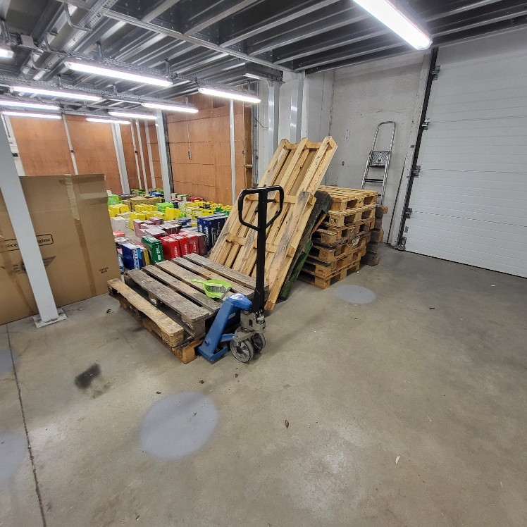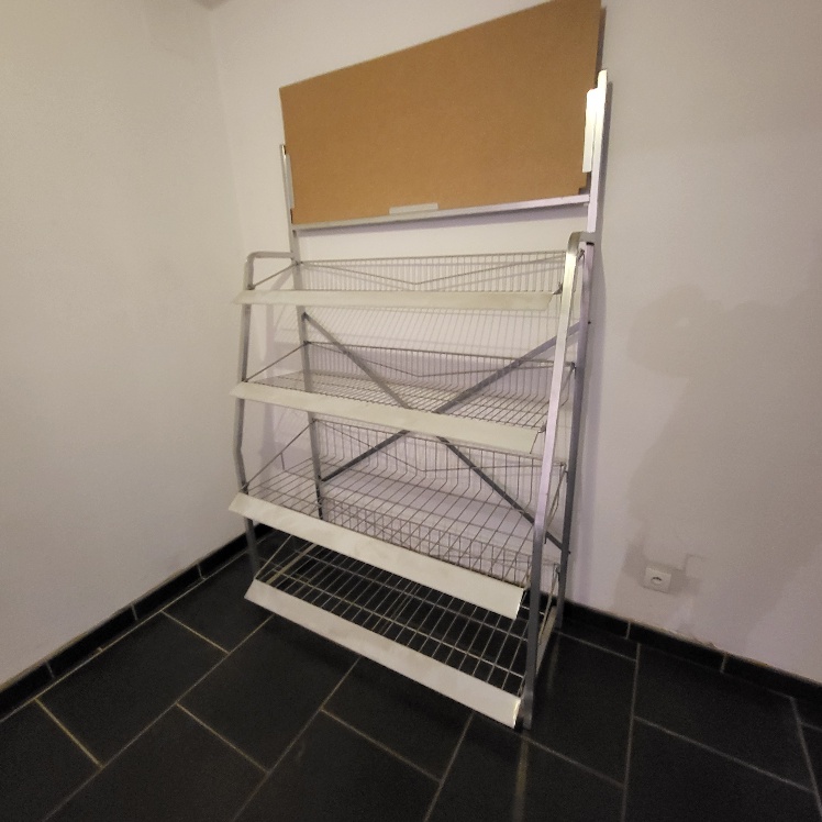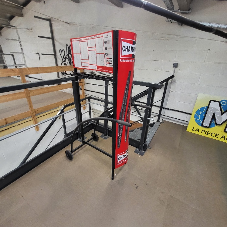 – Chariot « Roulpratic », étagère de présentation en acier grillagé à 4 niveaux – larg. 1.20m, transpalette manuel – cap. 2.5T, escabeau en alu à 5 marches, 3 présentoirs publicitaires métalliques laqués blanc, présentoir publicitaire mobile métallique laqué gris, environ 15 palettes en bois dont type « Europe », 3 chariots porte pare-brise métalliques laqués rouge
