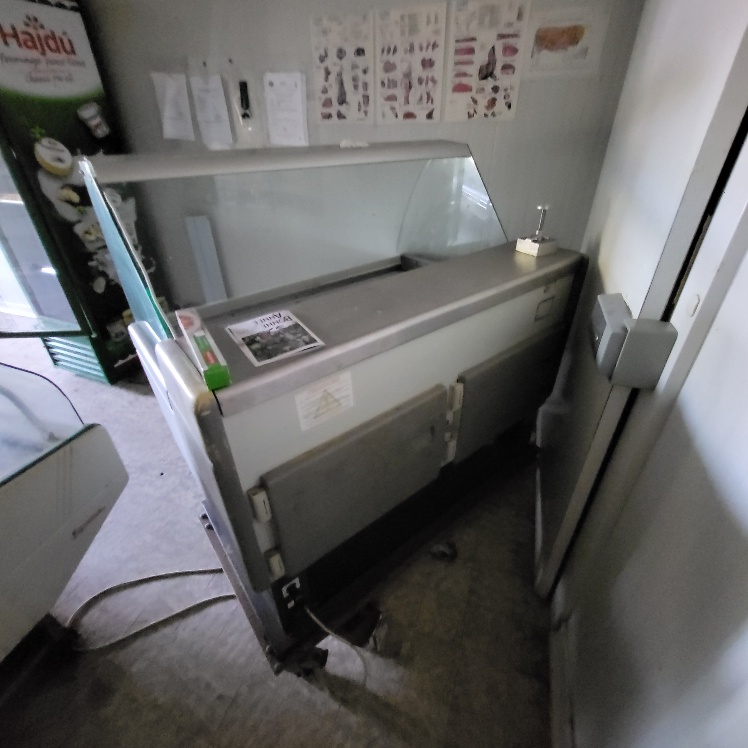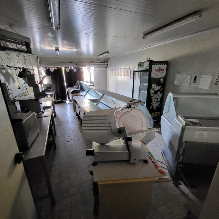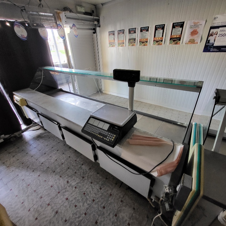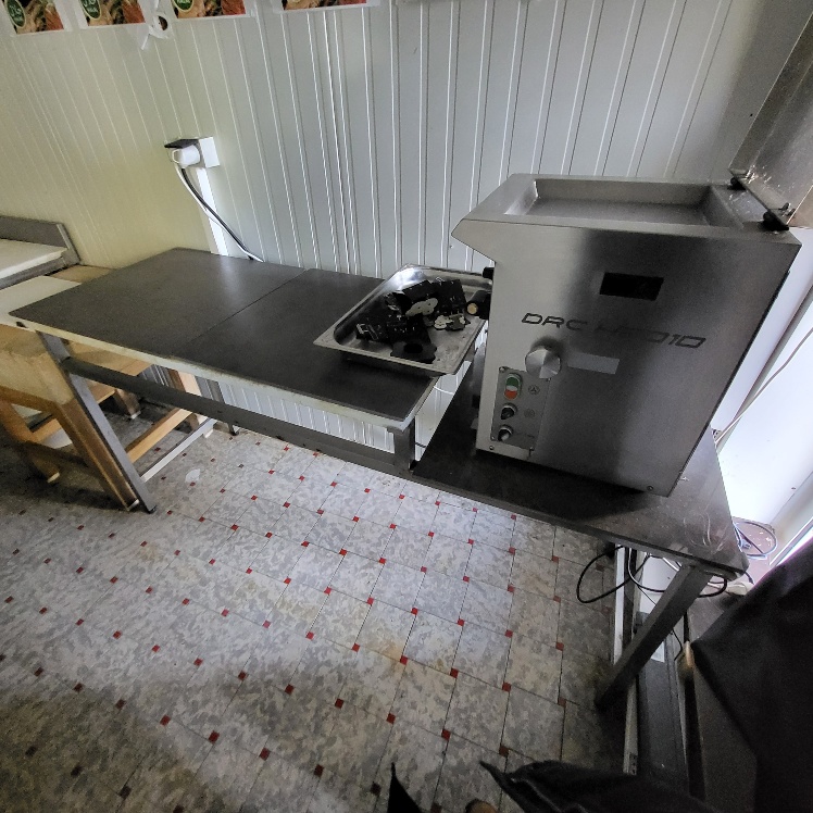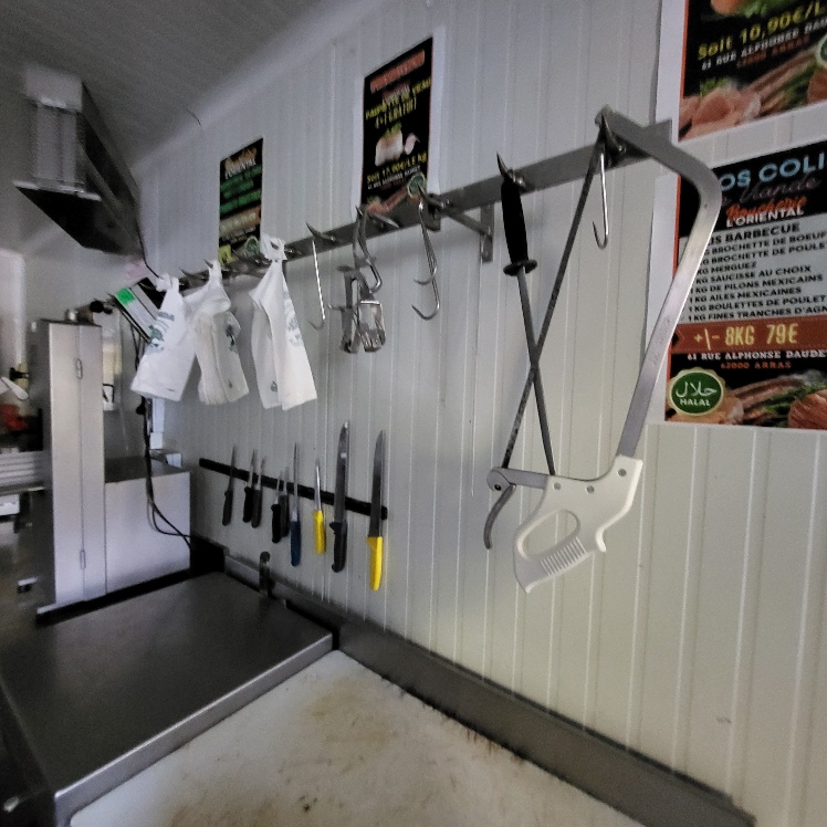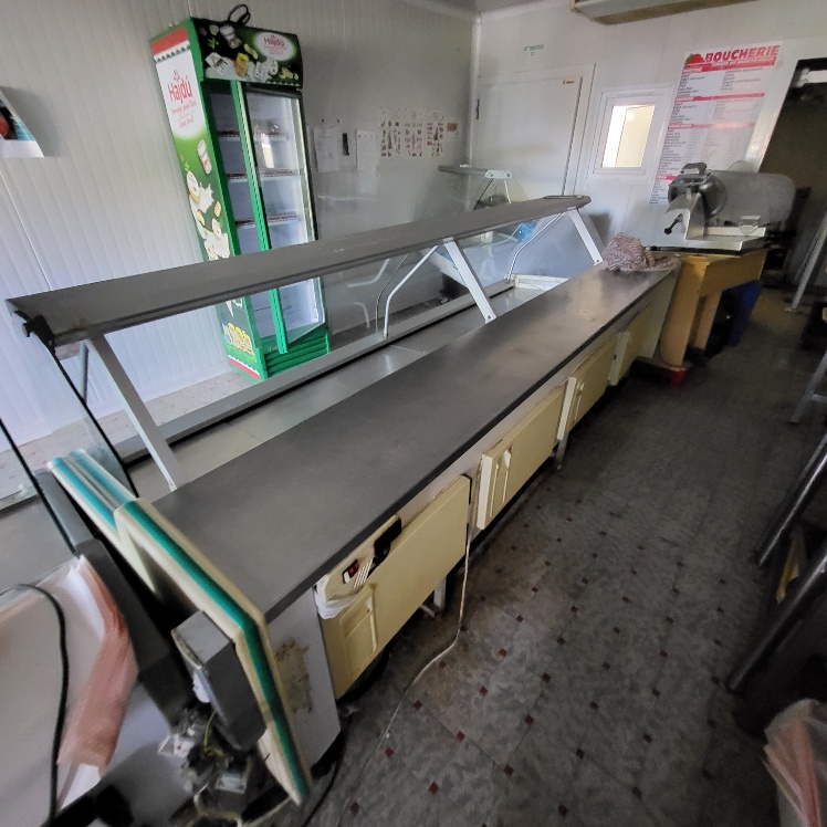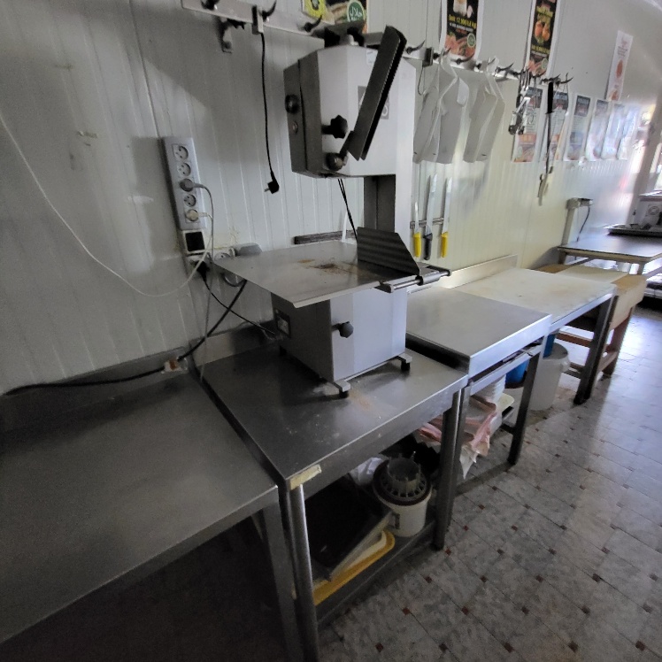 –2 hachoirs à viande DRC en inox (dont 1 en mauvais état), table de travail en fonte d’alu (mauvais état), billot de boucher en bois – larg. 0.60m, Table de découpe en inox et polyéthylène – larg. 1.50m, balance électronique OHAUS à afficheur détaché – cap. maxi. 300kg, scie à os MADO en inox, table d’appoint carrée en inox à 2 niveaux – larg. 0.60m, table de travail rectangulaire en inox – larg. 1.50m, 2 destructeurs d’insectes, stérilisateur mural de couteaux sans marque apparente, trancheuse à jambon en inox sans marque apparente, 2 comptoirs-vitrines réfrigérés sans marques apparentes – larg. 3m – groupes logés (doivent être démontés pour sortir du local), balance électronique PRECIA MOLEN équipée d’une imprimante de ticket incorporé, vitrine verticale réfrigérée, pétrin à viande DEREUGNAUCOURT (mauvais état général – en partie démonté), poussoir à viande en inox – hors service, poubelle à pédale en pvc