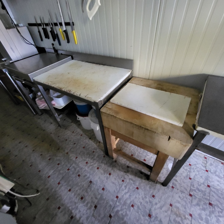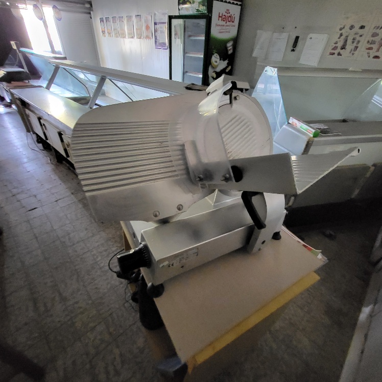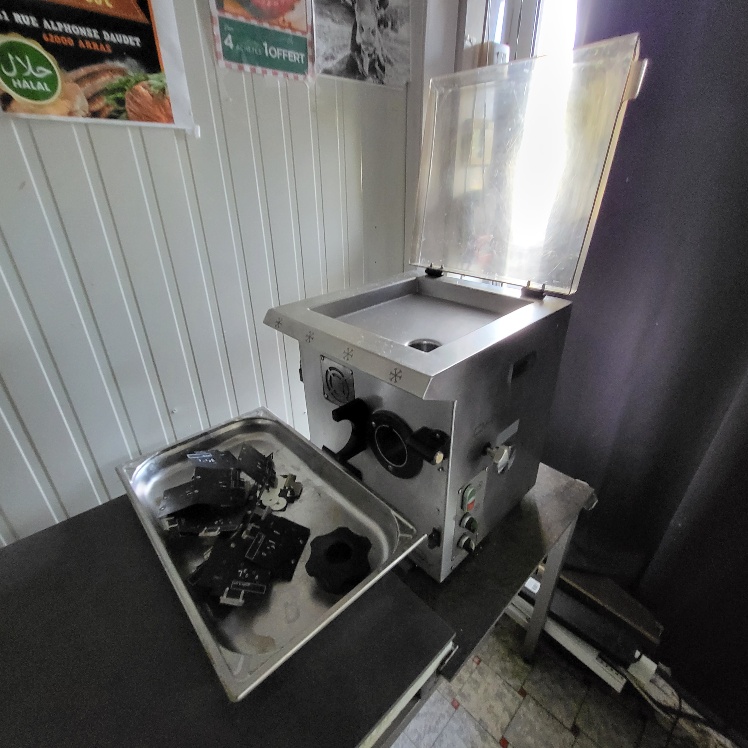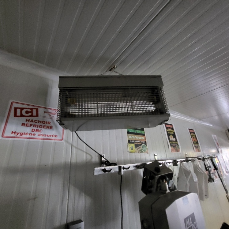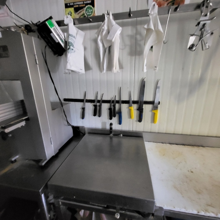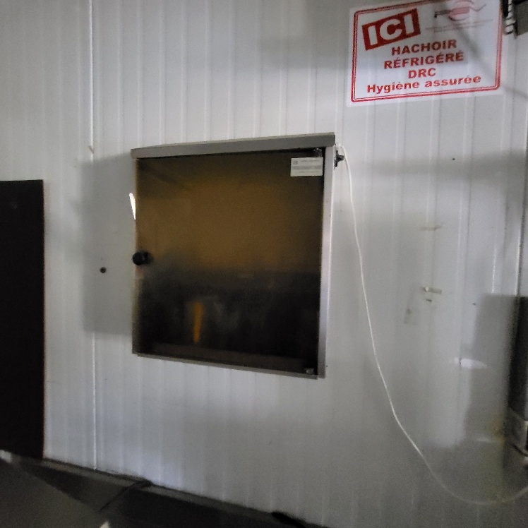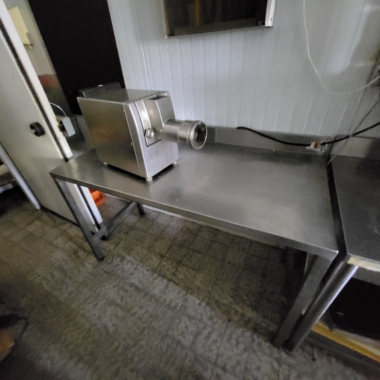 –2 hachoirs à viande DRC en inox (dont 1 en mauvais état), table de travail en fonte d’alu (mauvais état), billot de boucher en bois – larg. 0.60m, Table de découpe en inox et polyéthylène – larg. 1.50m, balance électronique OHAUS à afficheur détaché – cap. maxi. 300kg, scie à os MADO en inox, table d’appoint carrée en inox à 2 niveaux – larg. 0.60m, table de travail rectangulaire en inox – larg. 1.50m, 2 destructeurs d’insectes, stérilisateur mural de couteaux sans marque apparente, trancheuse à jambon en inox sans marque apparente, 2 comptoirs-vitrines réfrigérés sans marques apparentes – larg. 3m – groupes logés (doivent être démontés pour sortir du local), balance électronique PRECIA MOLEN équipée d’une imprimante de ticket incorporé, vitrine verticale réfrigérée, pétrin à viande DEREUGNAUCOURT (mauvais état général – en partie démonté), poussoir à viande en inox – hors service, poubelle à pédale en pvc