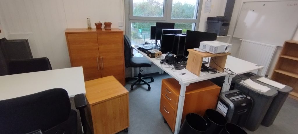 5 tables bureau à piettement métallique laqué blanc, dessus en mélaminé blanc