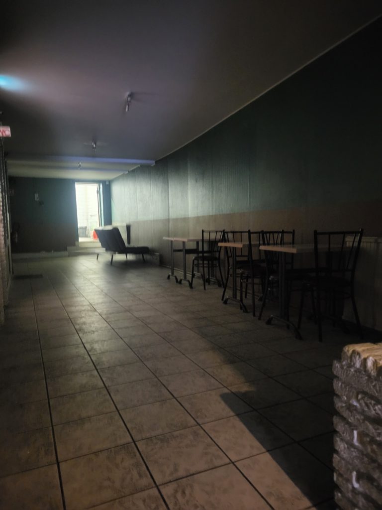 11 tables rectangulaires à piètement métallique laqué noir, dessus faux marbre