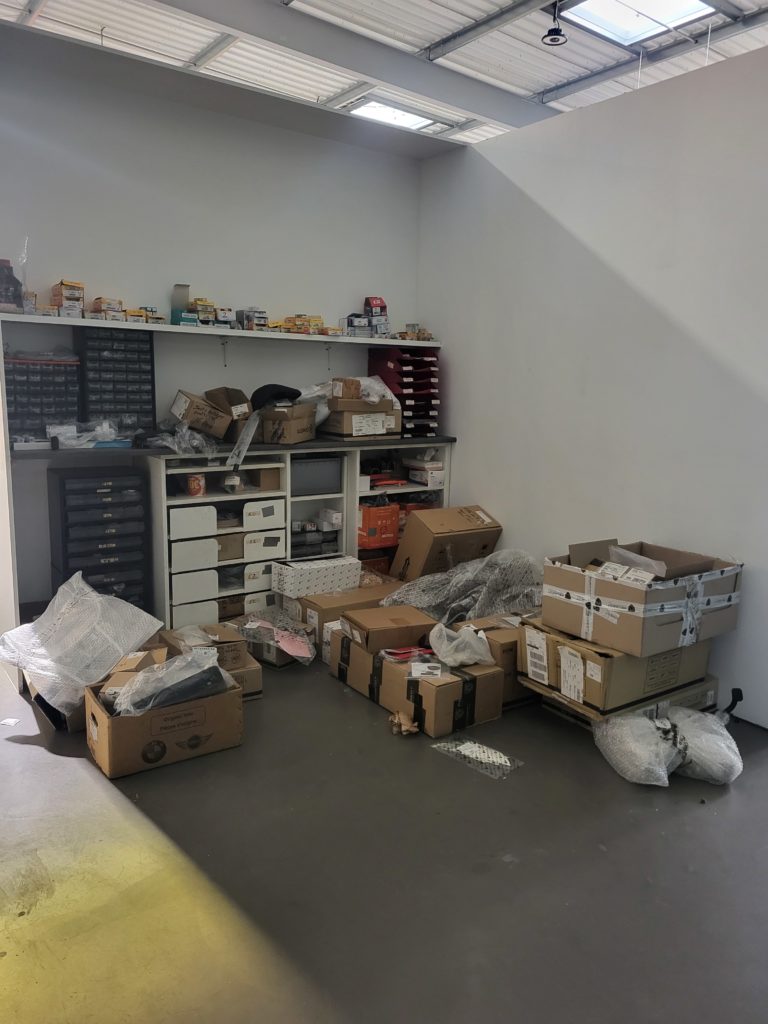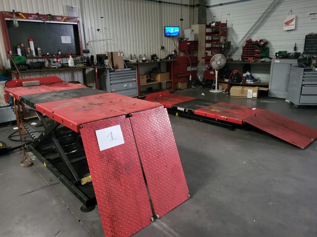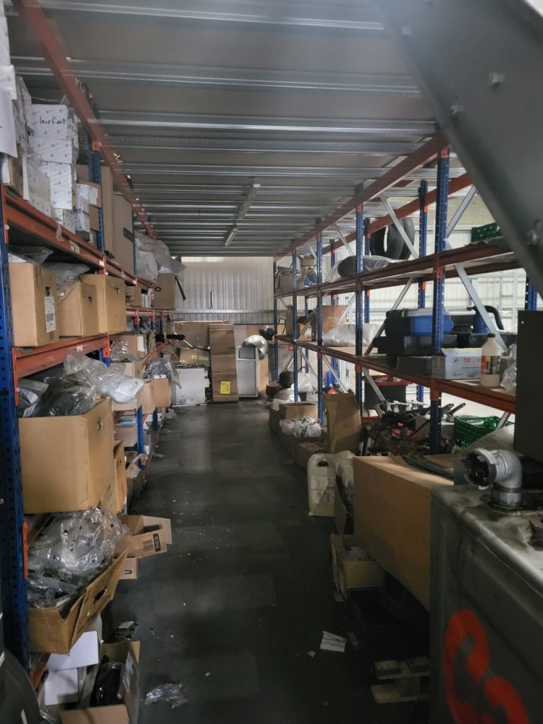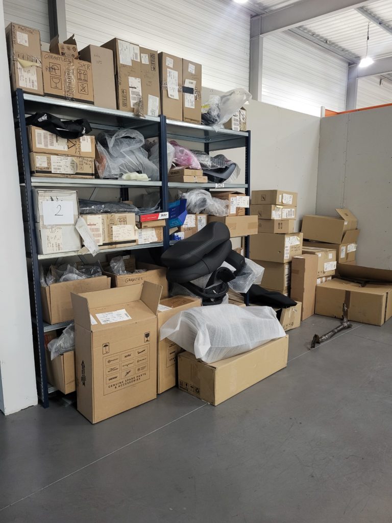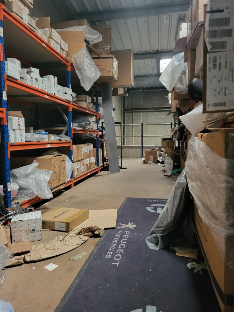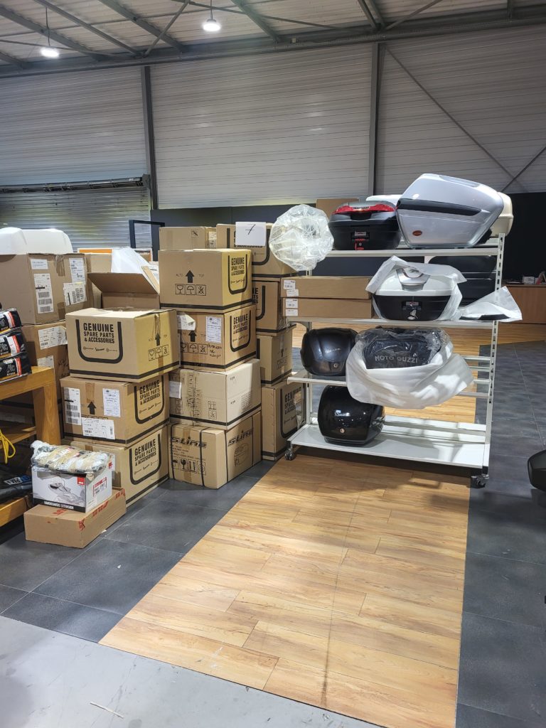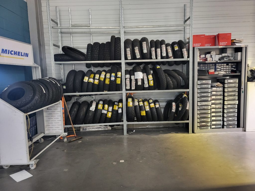 L’ensemble des pèces détachées, pneus et petits accessoires motos et scooter se trouvant dans l’atelier et dans la réserve