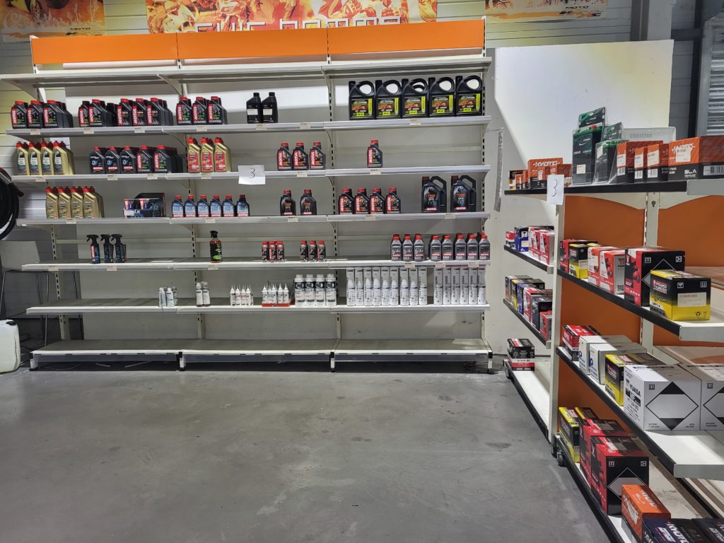 Environ 120 bidons d’huile 2Tet 4T ( 10w50/10w60), environ 50 batteries diverses, 2 batteries électriques et environ 50 produits d’entretien pour motos et scooters sans les rayonnages