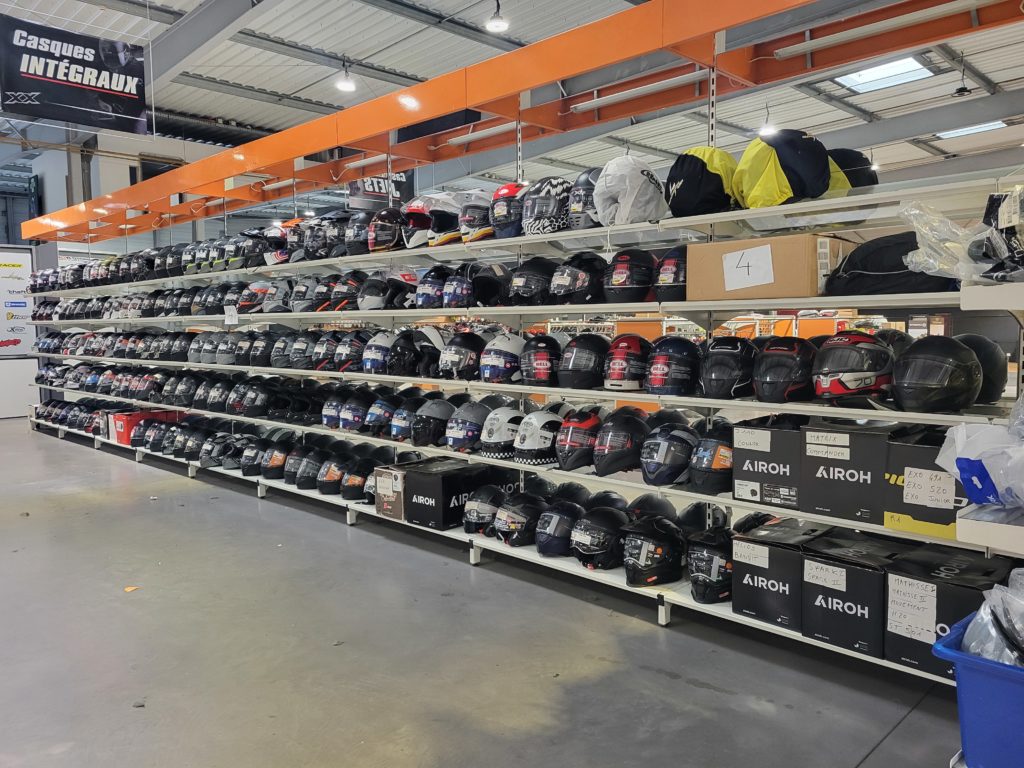 Environ 150 casques intégral et semi intégral neufs, quelques modèles cross, BELL, SCORPION, SHARK, AIROH,L52, HJC, NOLAN…, et lot de visières correspondantes ( casques sans les boites ) sans les rayonnages