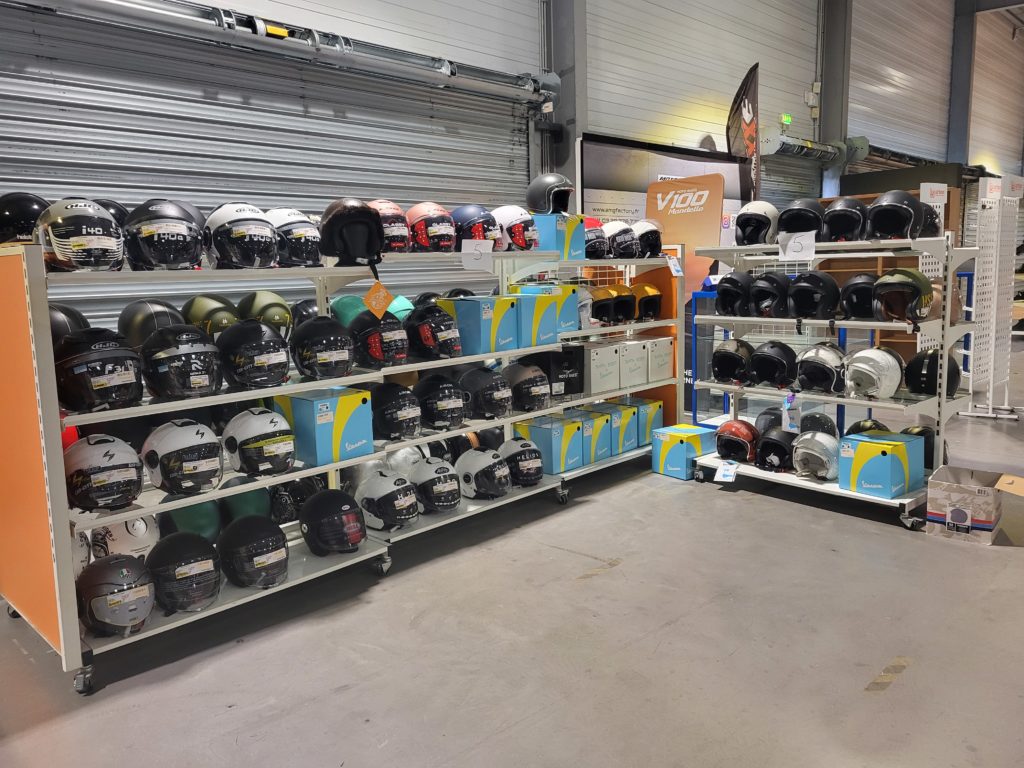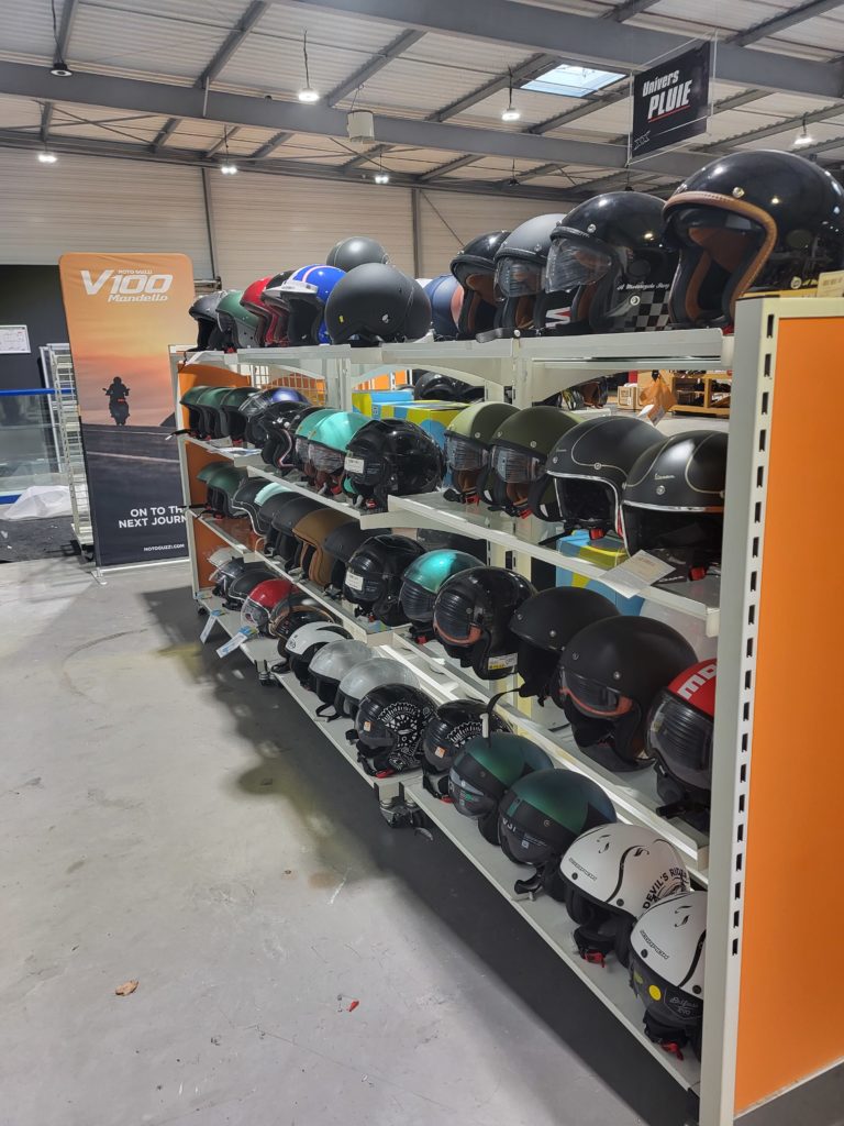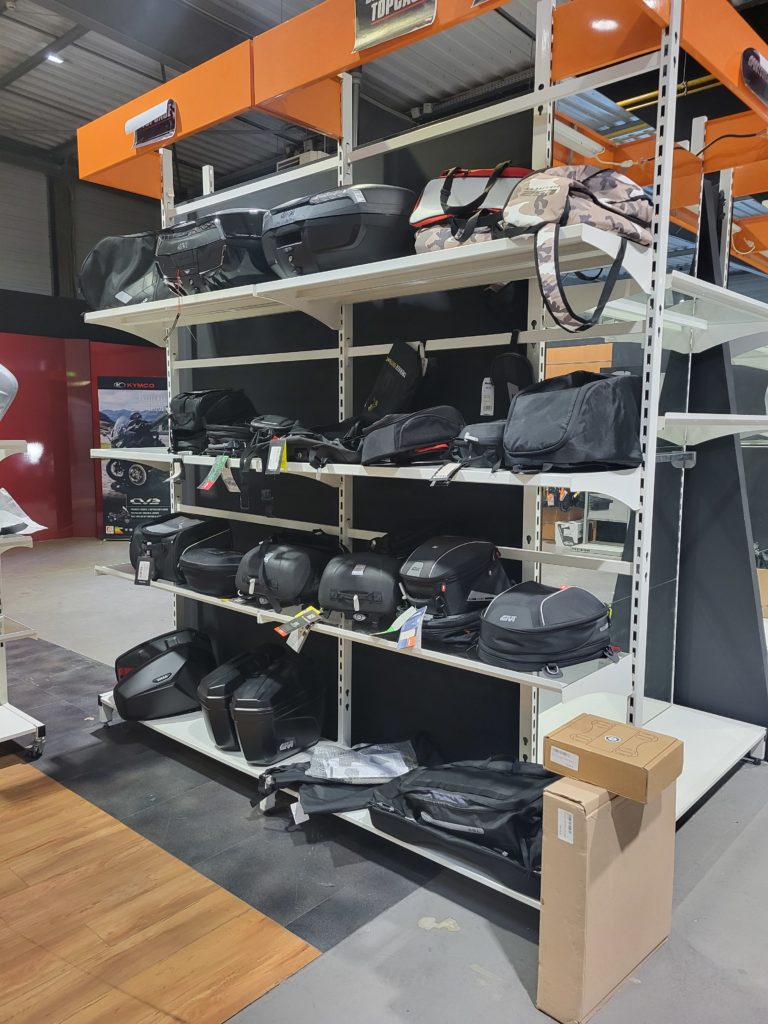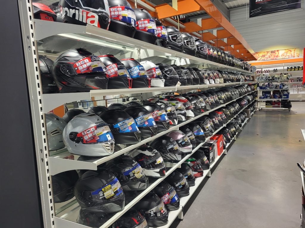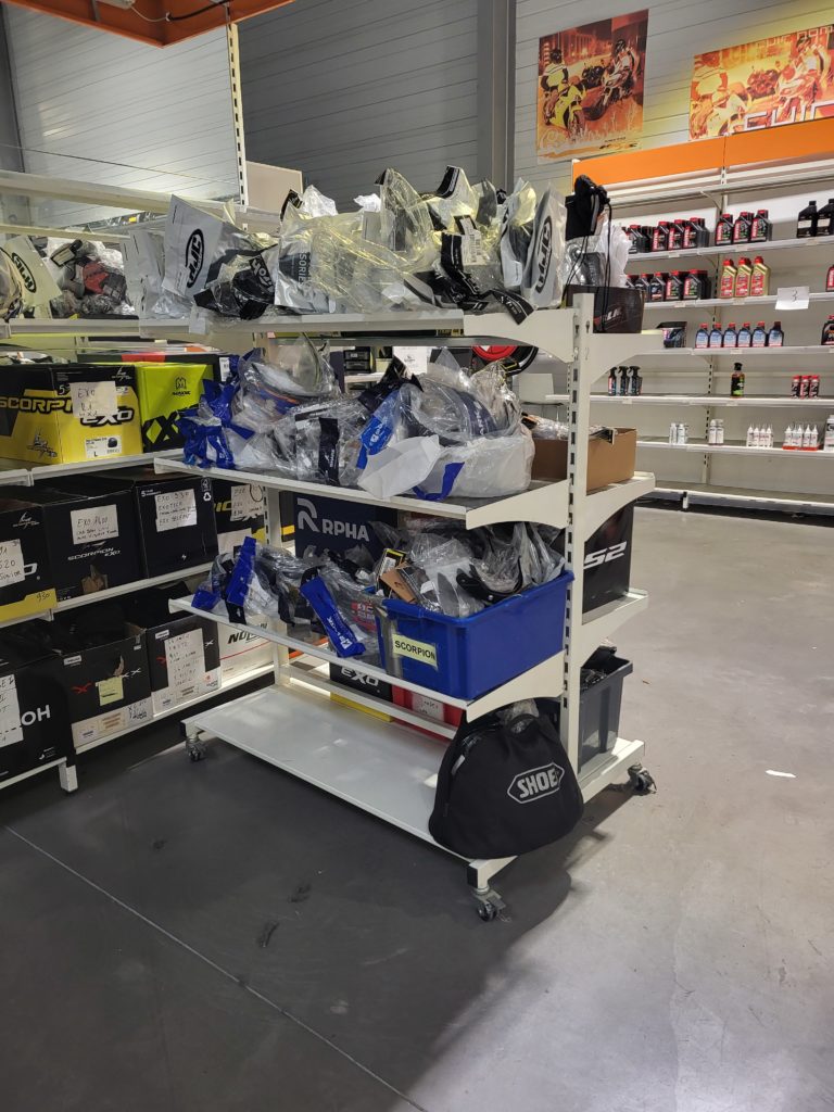 Ensemble des gondoles, présentoirs à motos et casques, comptoirs et agencement divers machine à café, réfrigérateur table top dans le magasin