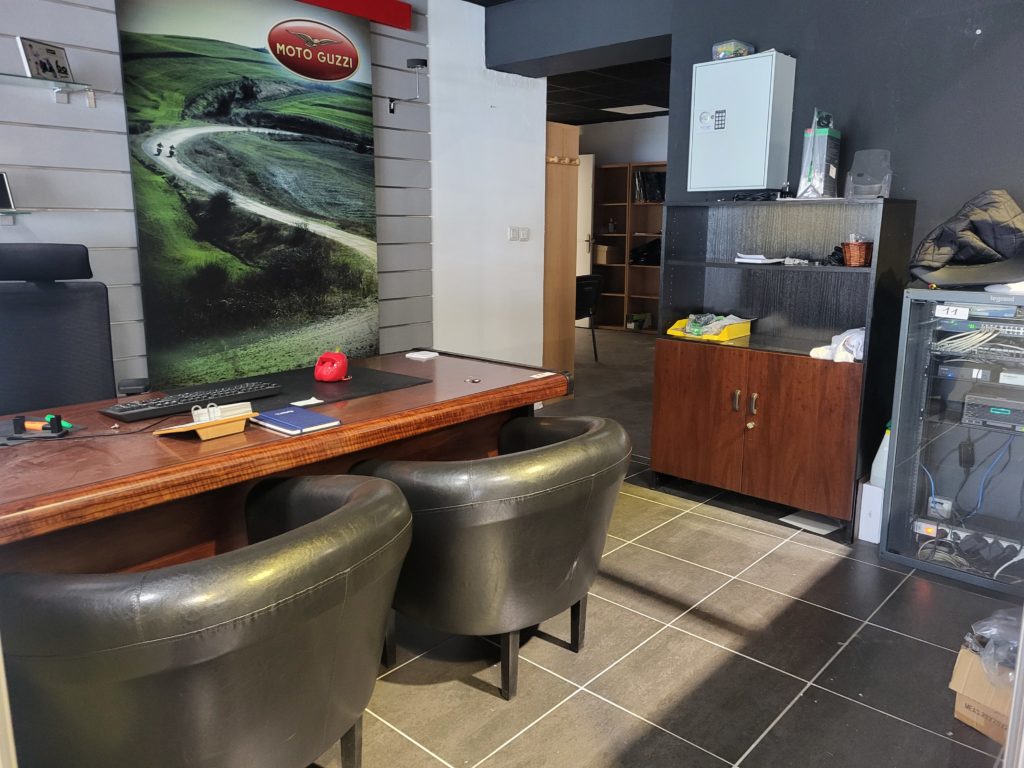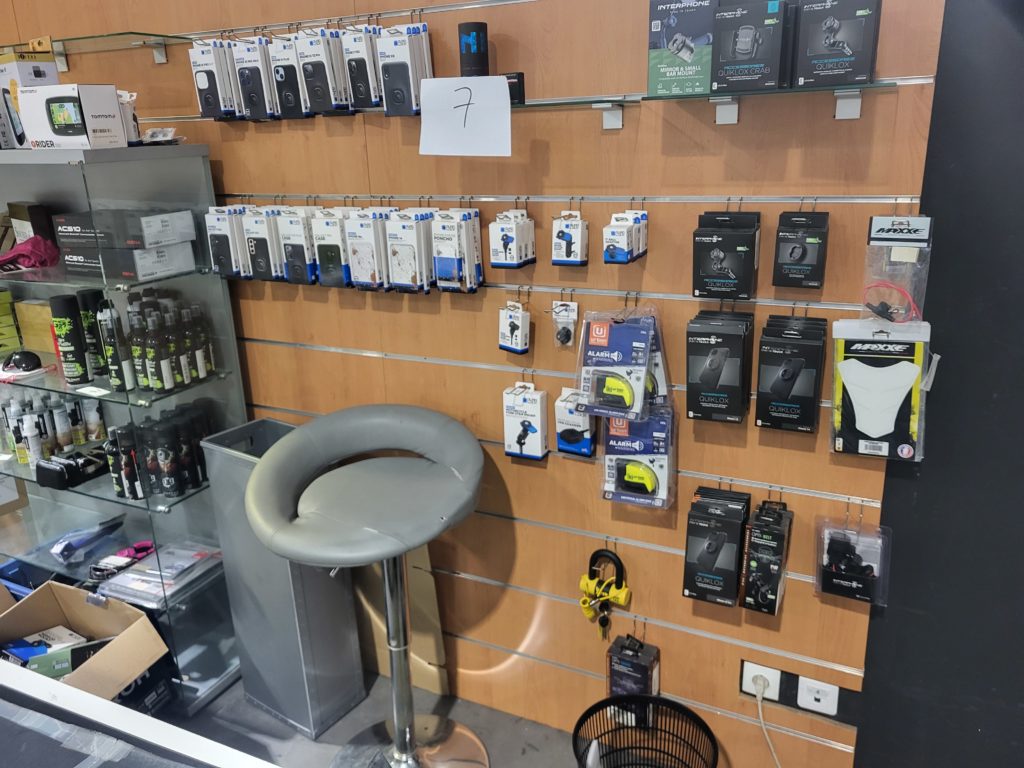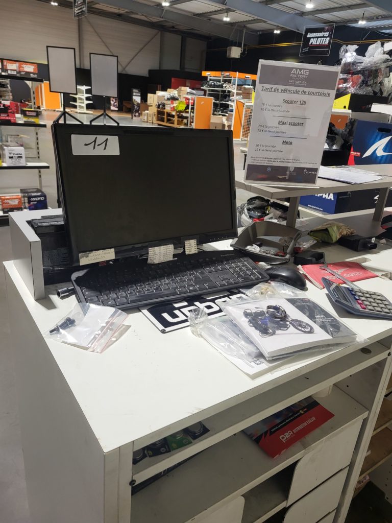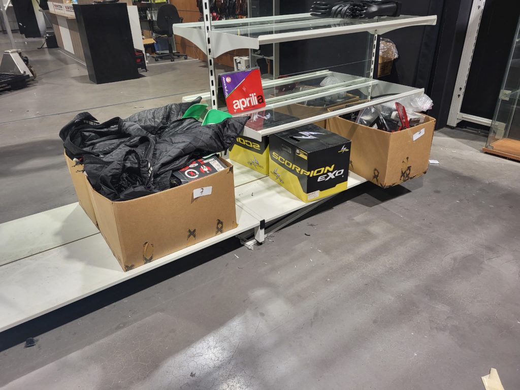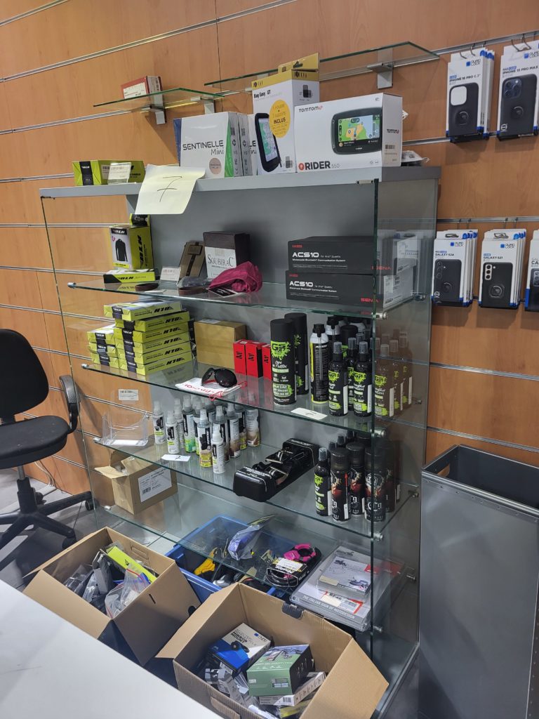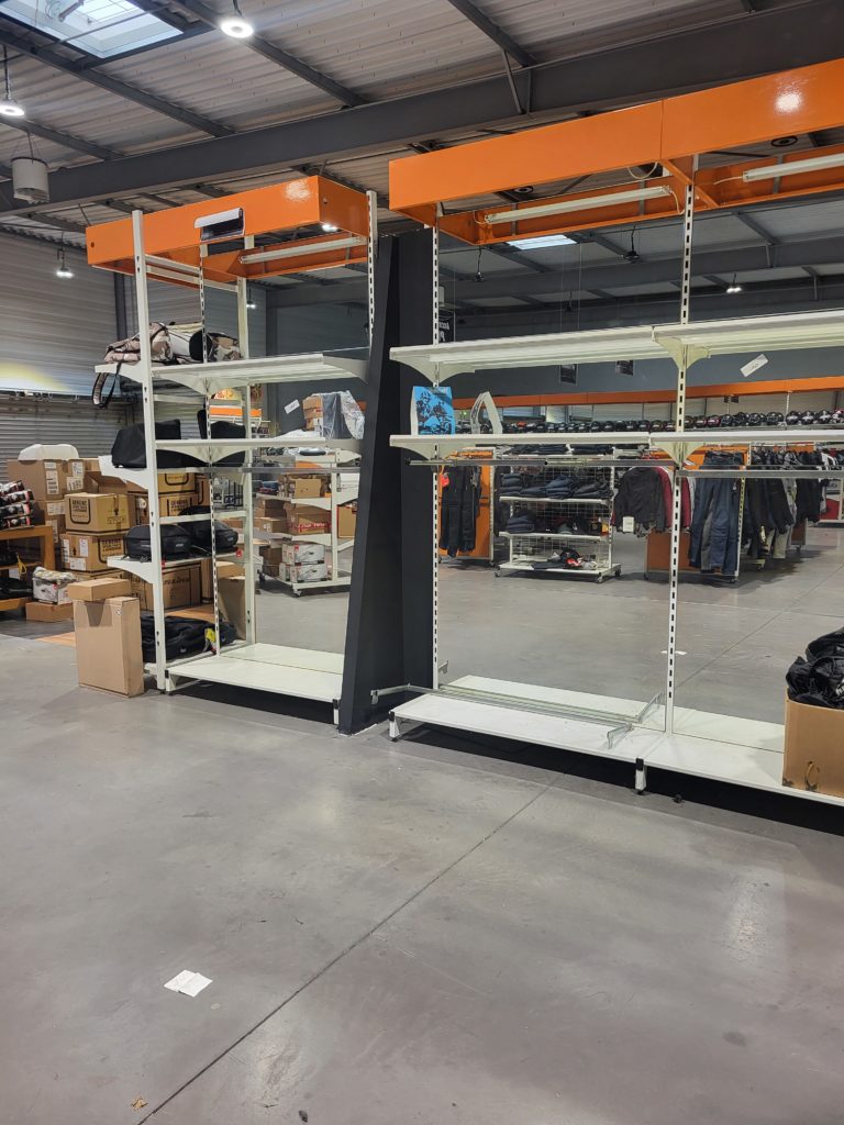 Ensemble des gondoles, présentoirs à motos et casques, comptoirs et agencement divers machine à café, réfrigérateur table top dans le magasin