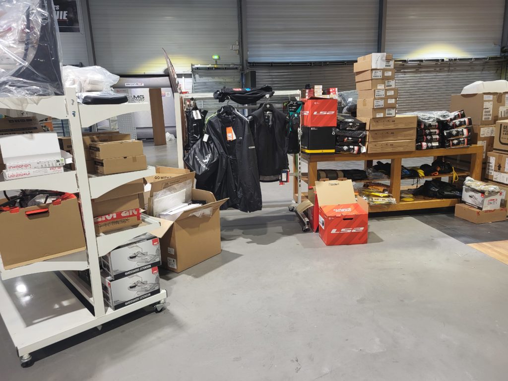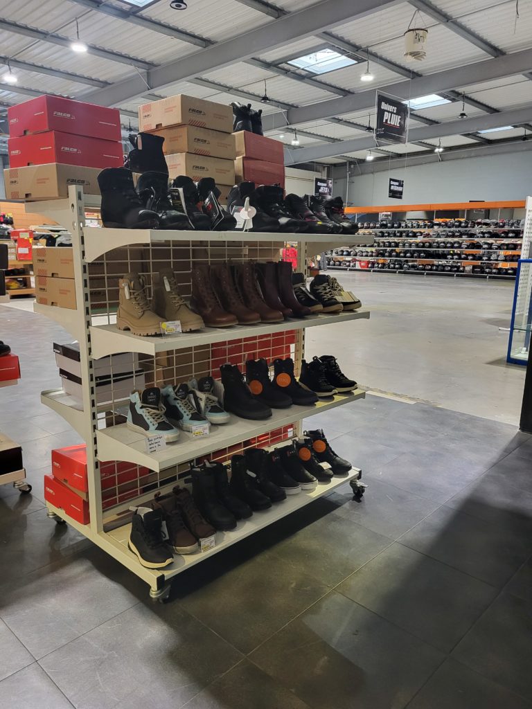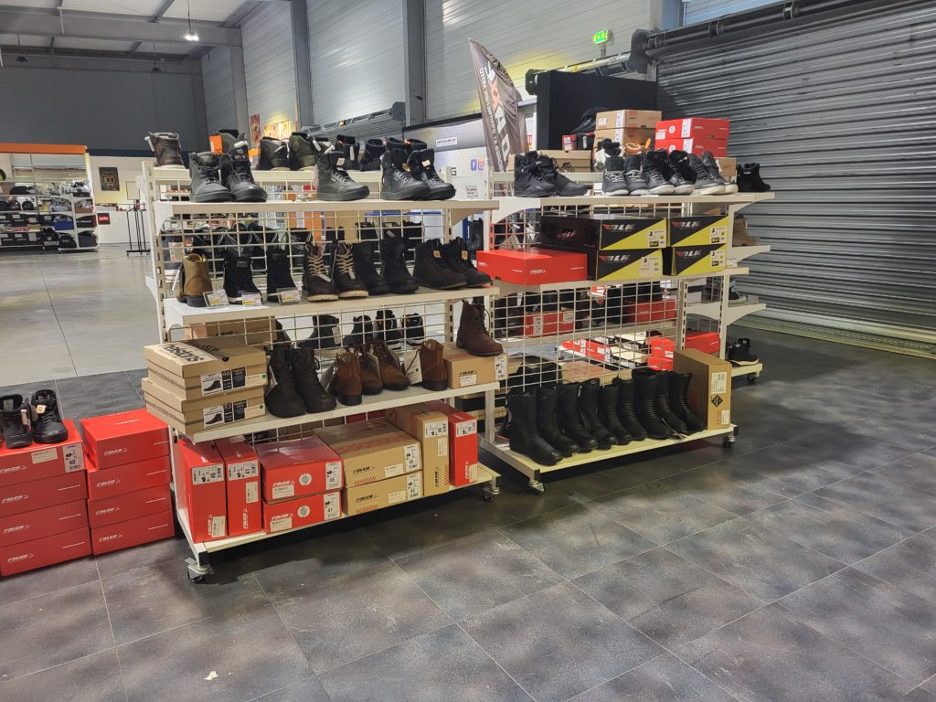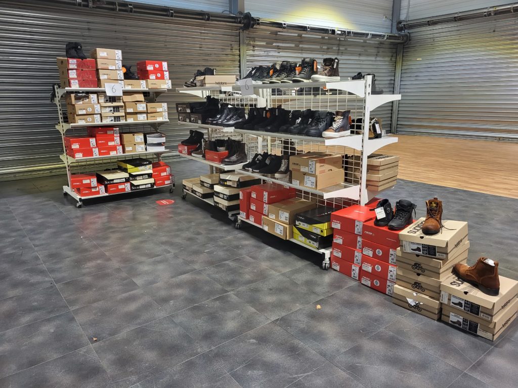 Environ 75 paires de chaussures et bottes moto neuves FALCO, HELSTONS,BLH, IXON .. sans les rayonnages