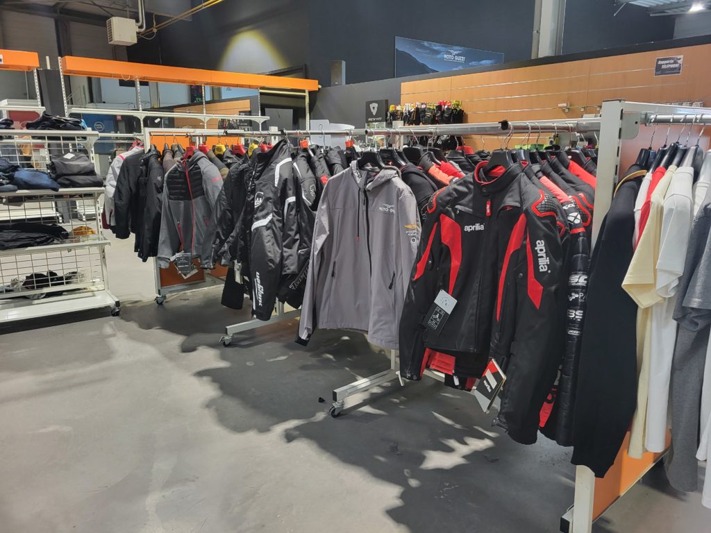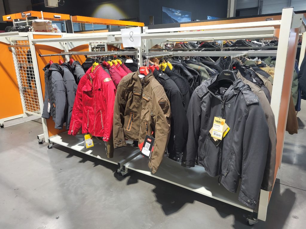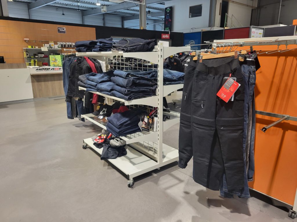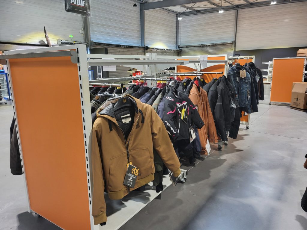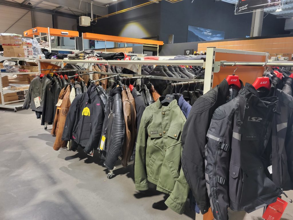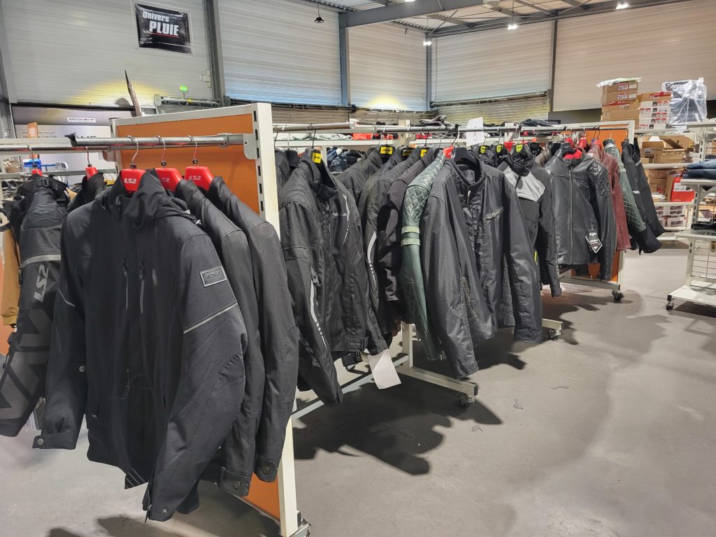 Environ160 blousons et vestes motos en cuir et synthétique (en partie homologués), environ 40 jeans, tee shirt, sans les rayonnages