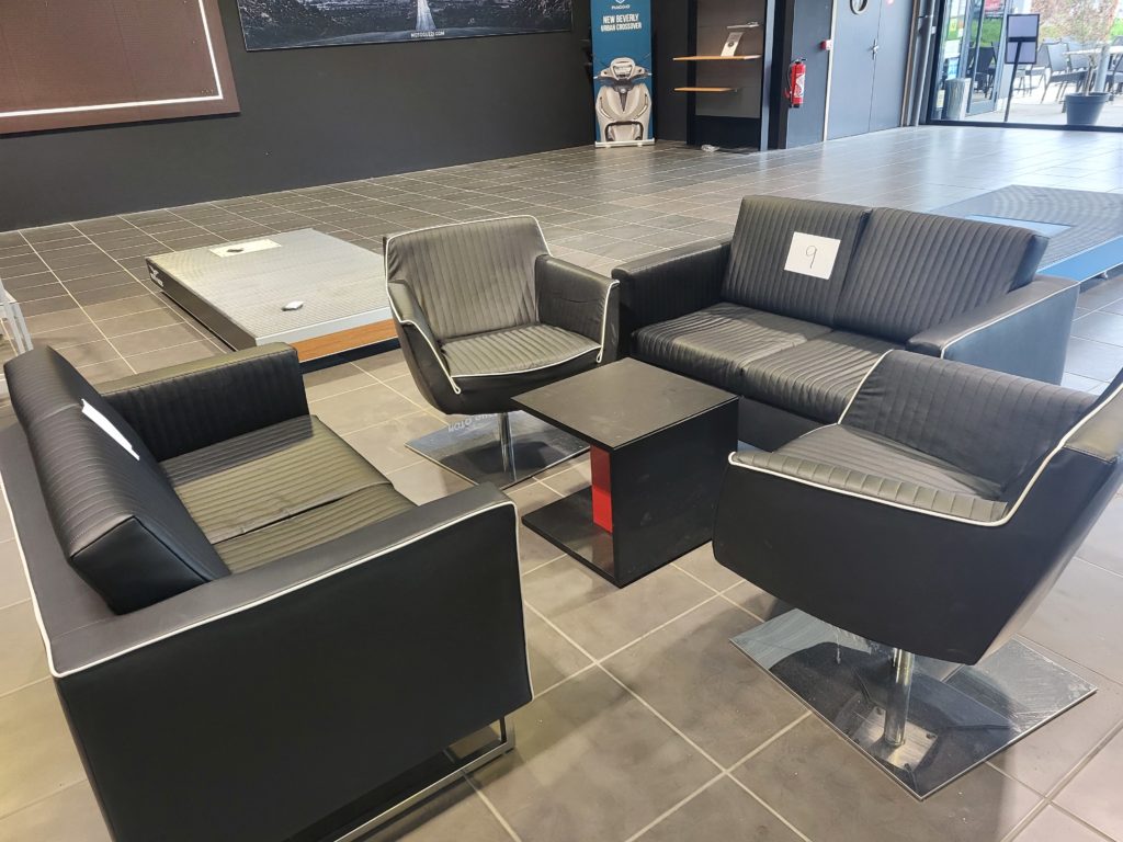 Salon d’attente comprenant 2 banquettes 2 places, 2 fauteuils rotatif en simili cuir noir